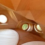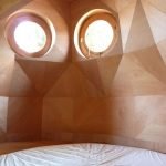 In structural terms, the whole conception has been constructed from timber components, which results in an array of geometric angular facades in the interiors of the Owl Cabin. However, the linearity of the inside is matched by the deftly crafted bulbous cylindrical shape of the exterior form. This rotund facade is perforated by two round ‘porthole’ windows at the top level that mimic the big eyes of an average owl. All of these is topped up by an interesting looking roof finish that imitates the feathery texture of the nocturnal predator’s unnaturally large forehead.