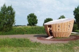 Circular home featuring walls with corn cobs
