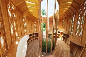 Circular home featuring walls with corn cobs